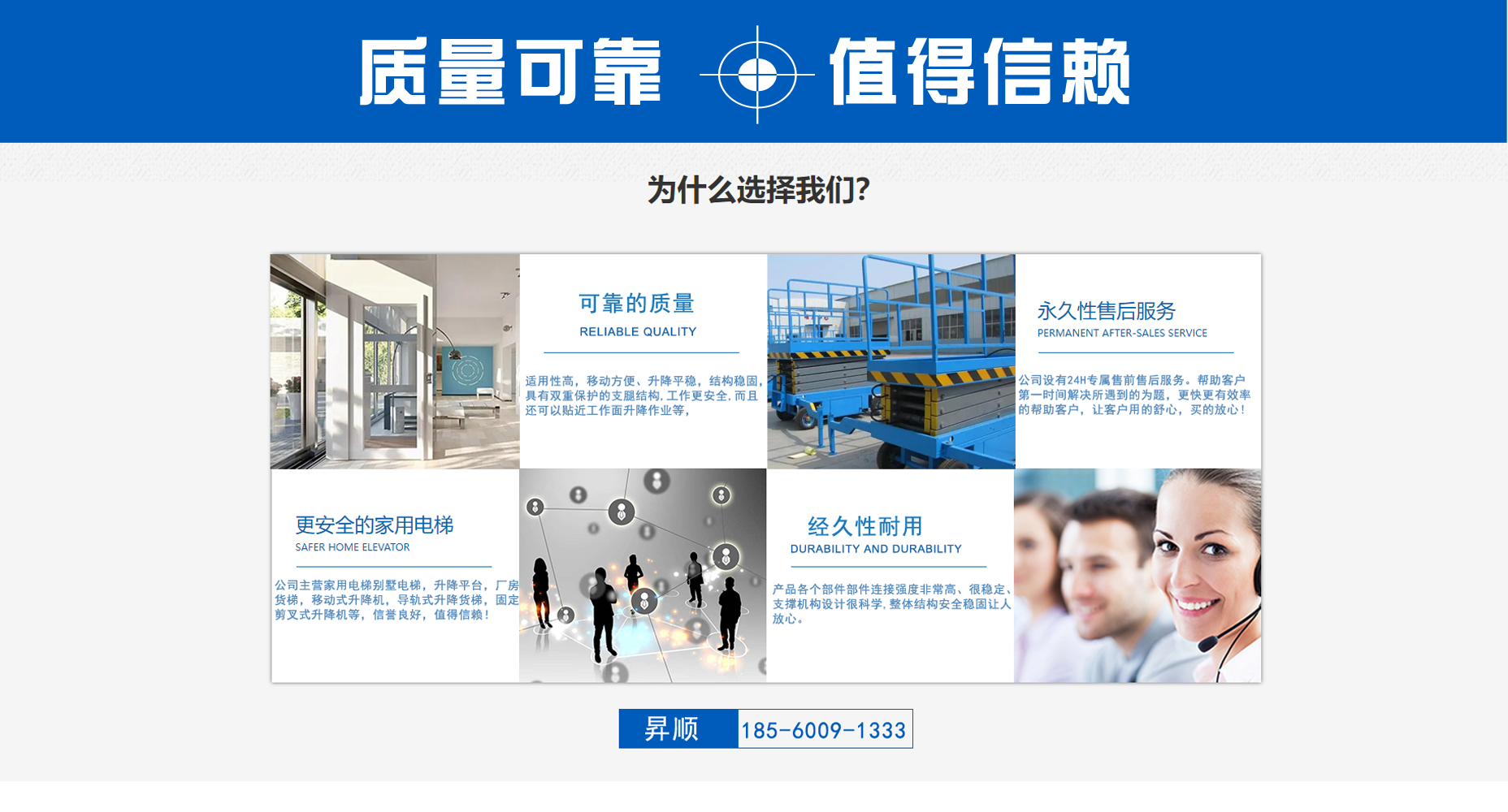 山東昇順液壓升降機械有限公司是一家主營家用電梯,別墅電梯,升降平臺,廠房貨梯,移動式升降機,導軌式升降貨梯,固定剪叉式升降機等產品企業,質量可靠,值得信賴?! ∮脩糁辽希杂脩魹橹行摹笔枪居肋h堅持的服務宗旨,贏得用戶的贊許是我們的榮譽,及時滿足用戶的需求,是我們公司的愿望。長期以來,公司員工以優質的服務,取悅于用戶,以誠信的言行取信于用戶,得到了用戶們的好評。我們期待著與您更加愉快的合作!公司的發展,離不開社會的大力支持,在社會的支持和幫助下,我們正昂首闊步邁向未來! 我們的經營方針是:以質量求生存,以產品求發展,以信譽保合作,以服務贏客戶?! ”竟緦Ξa品質量和各項服務恪守合同承諾,并愿與新老客戶精誠合作,共創未來?! 」揪瘢簞撔率侵黝},超越是不懈的追求?! 」咀谥迹盒抛u保證,誠信為本。 我們會以合理的價格,良好的信譽,雄厚的實力,優質的產品,最周到的服務,服務于廣大新老客戶!...